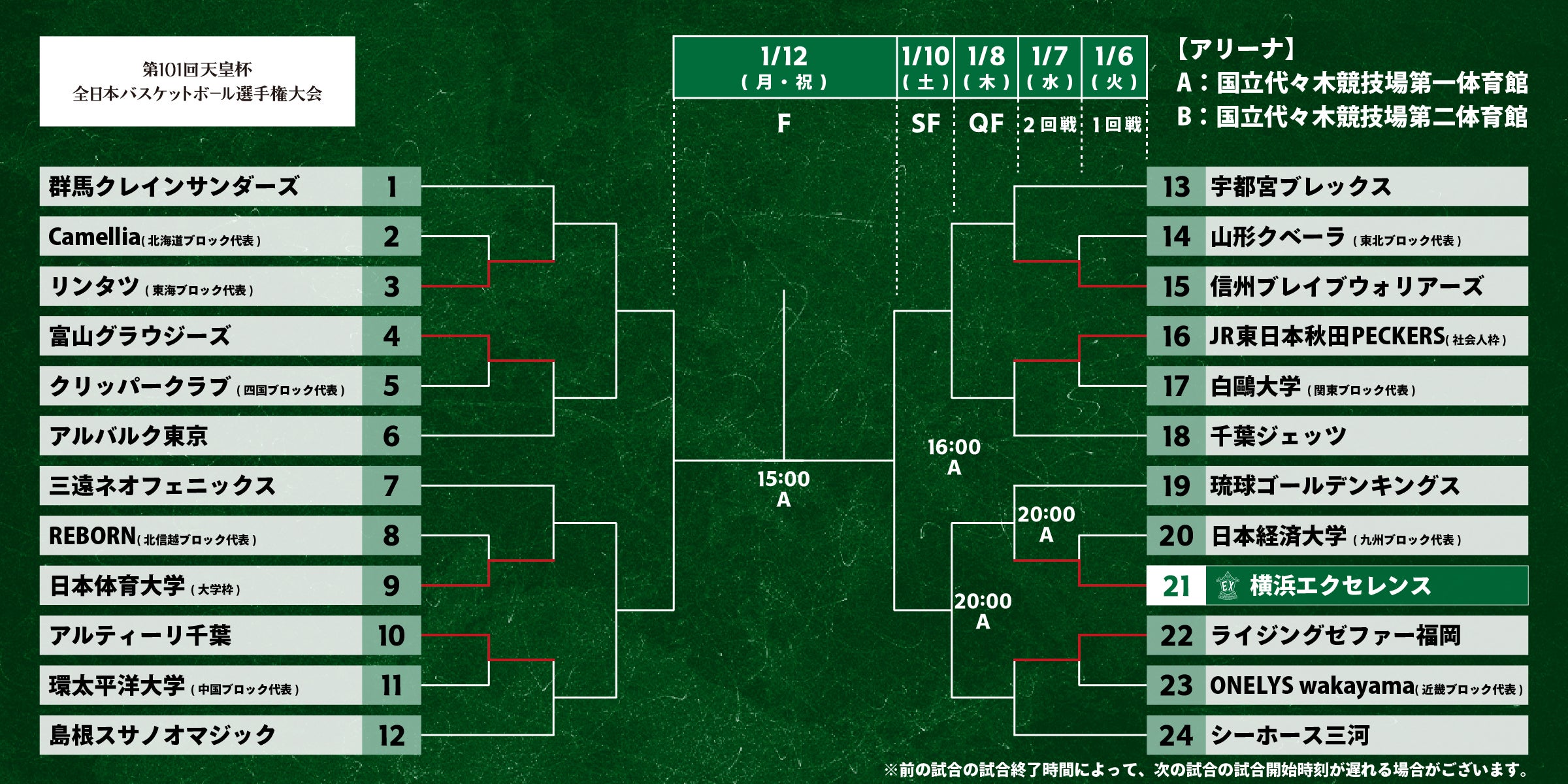 なお、トーナメント表および横浜エクセレンスが勝ち進んだ際の各種アリーナ及び試合日程については下記の通りです。