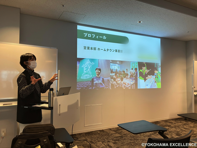 クラブ紹介を交えながら、推進する地域連携活動「EX Community Project」を中心にお話をさせていただきました。中でも、この仕事に就くきっかけや、仕事のやりがいなどについて興味を持って聞いていただき、プロスポーツクラブを「ささえる」仕事の側面に興味を持っていただくことができたのではないかと思います。