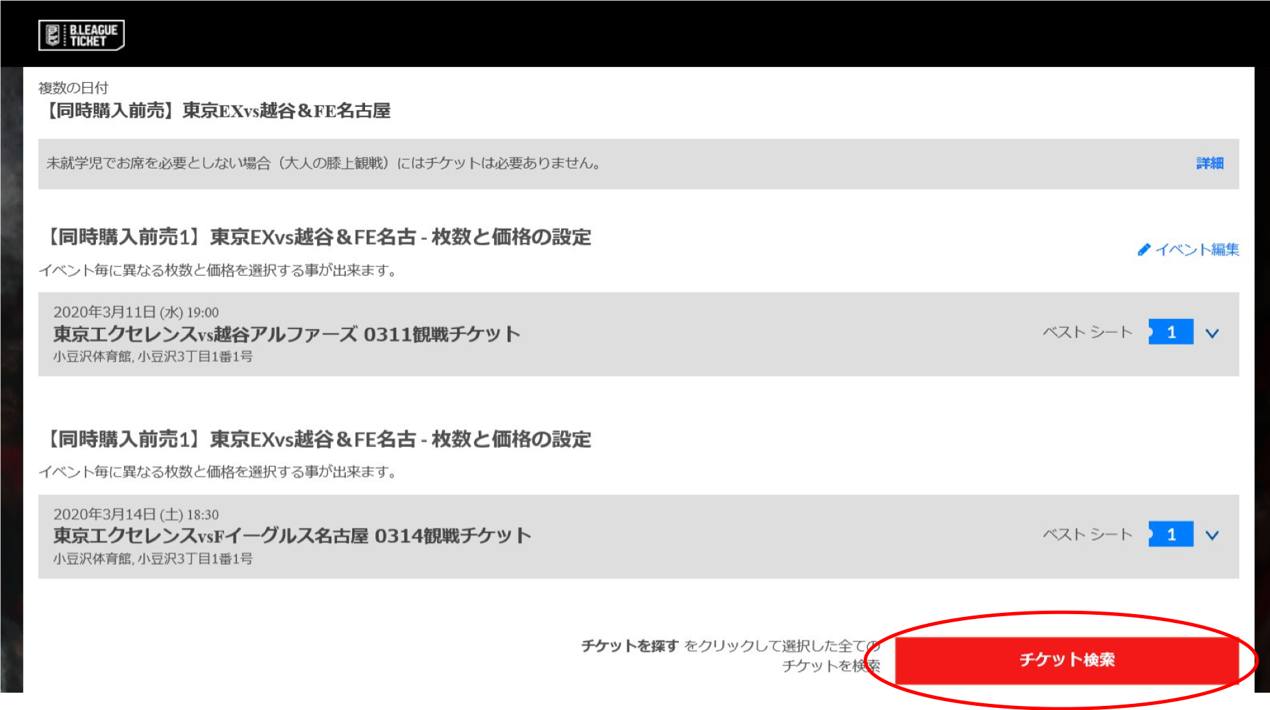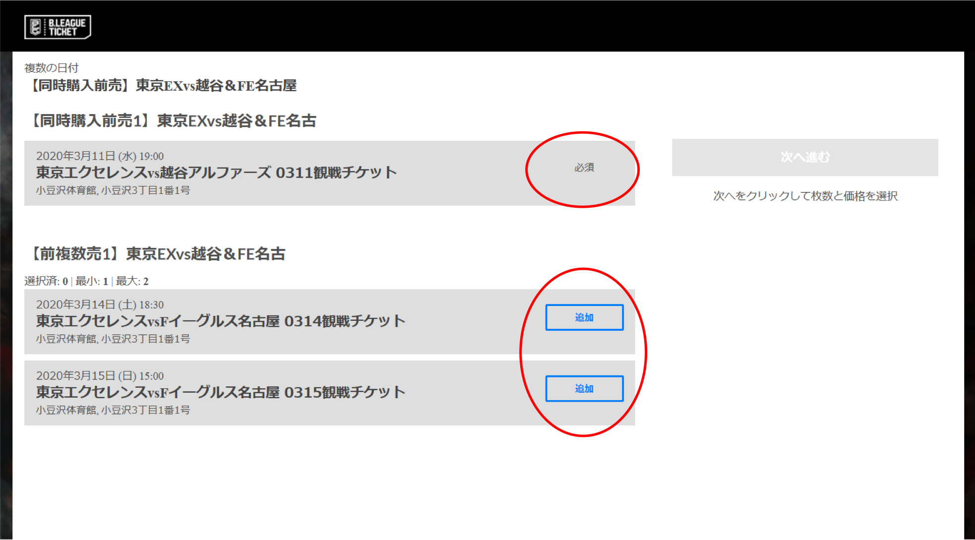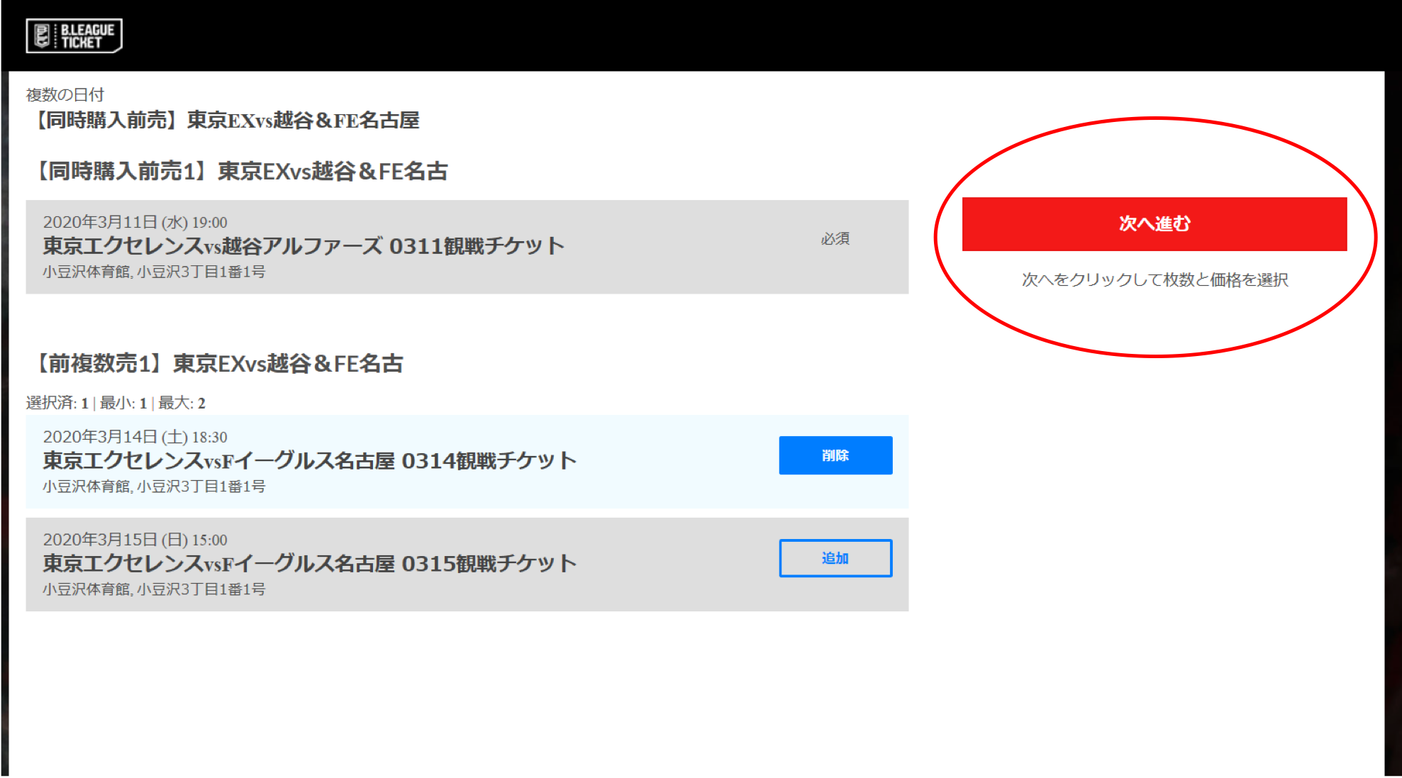 1、Bリーグチケットより「2節同時購入前売」を選択