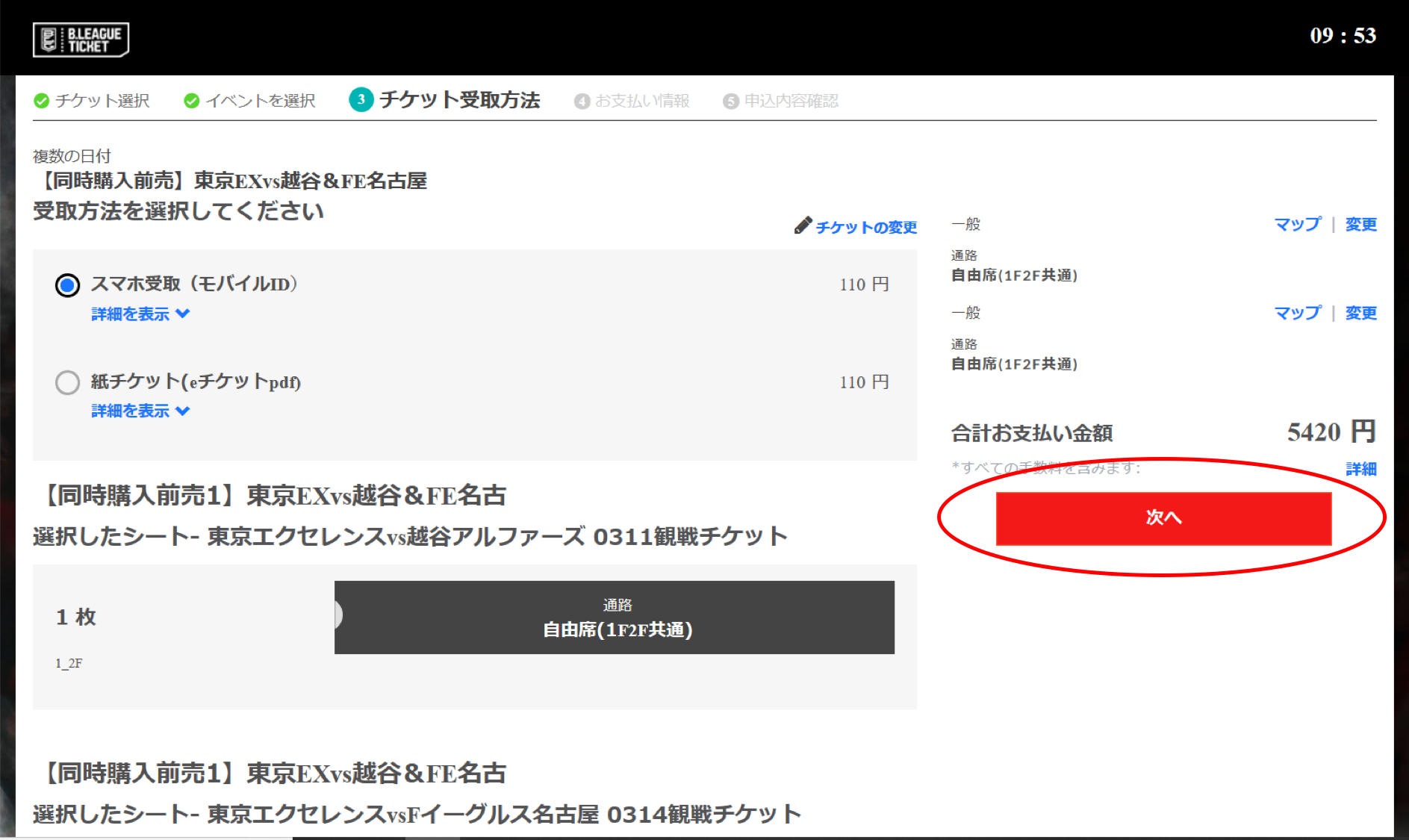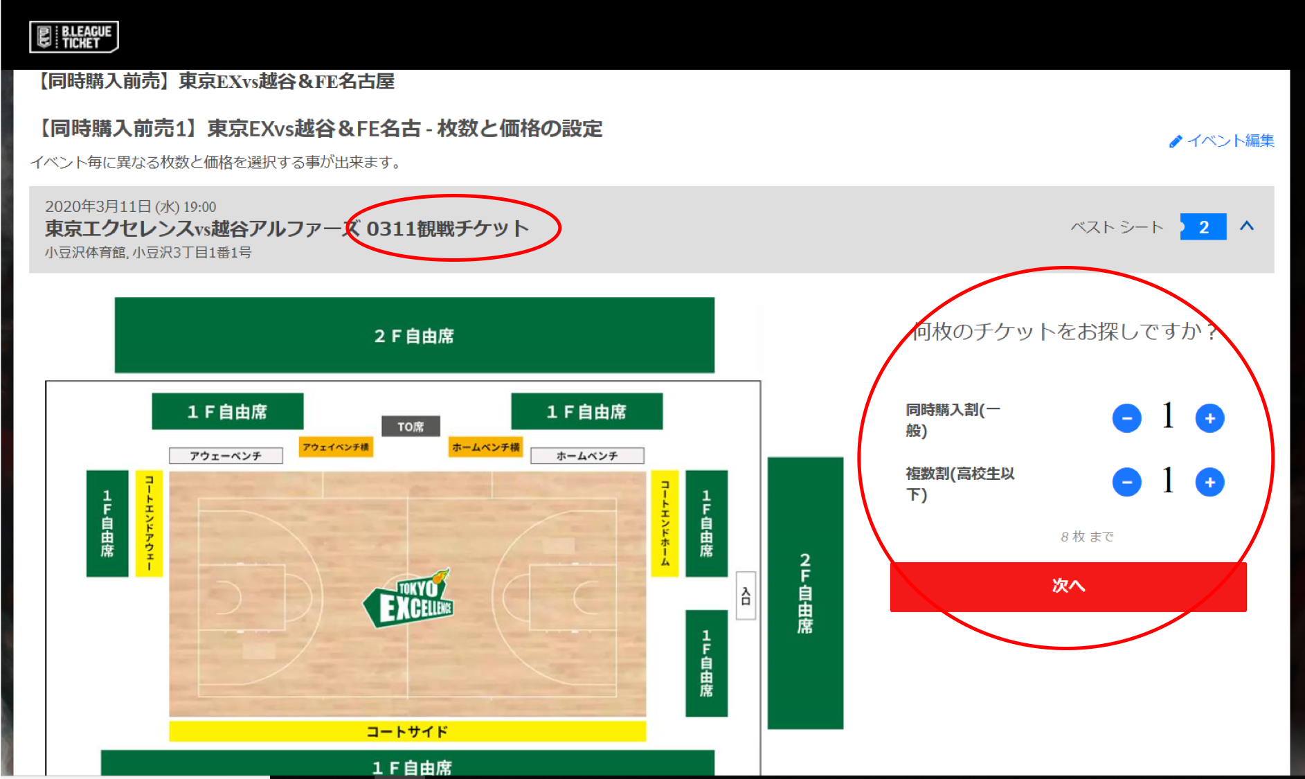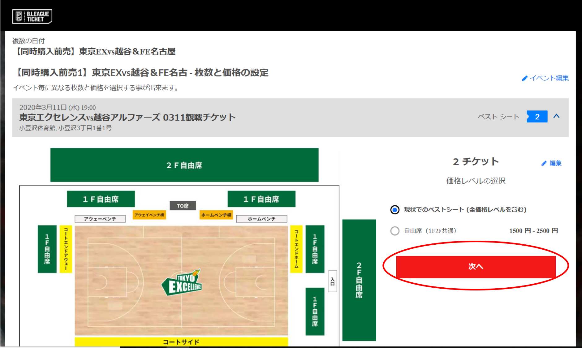 1、Bリーグチケットより「2節同時購入前売」を選択