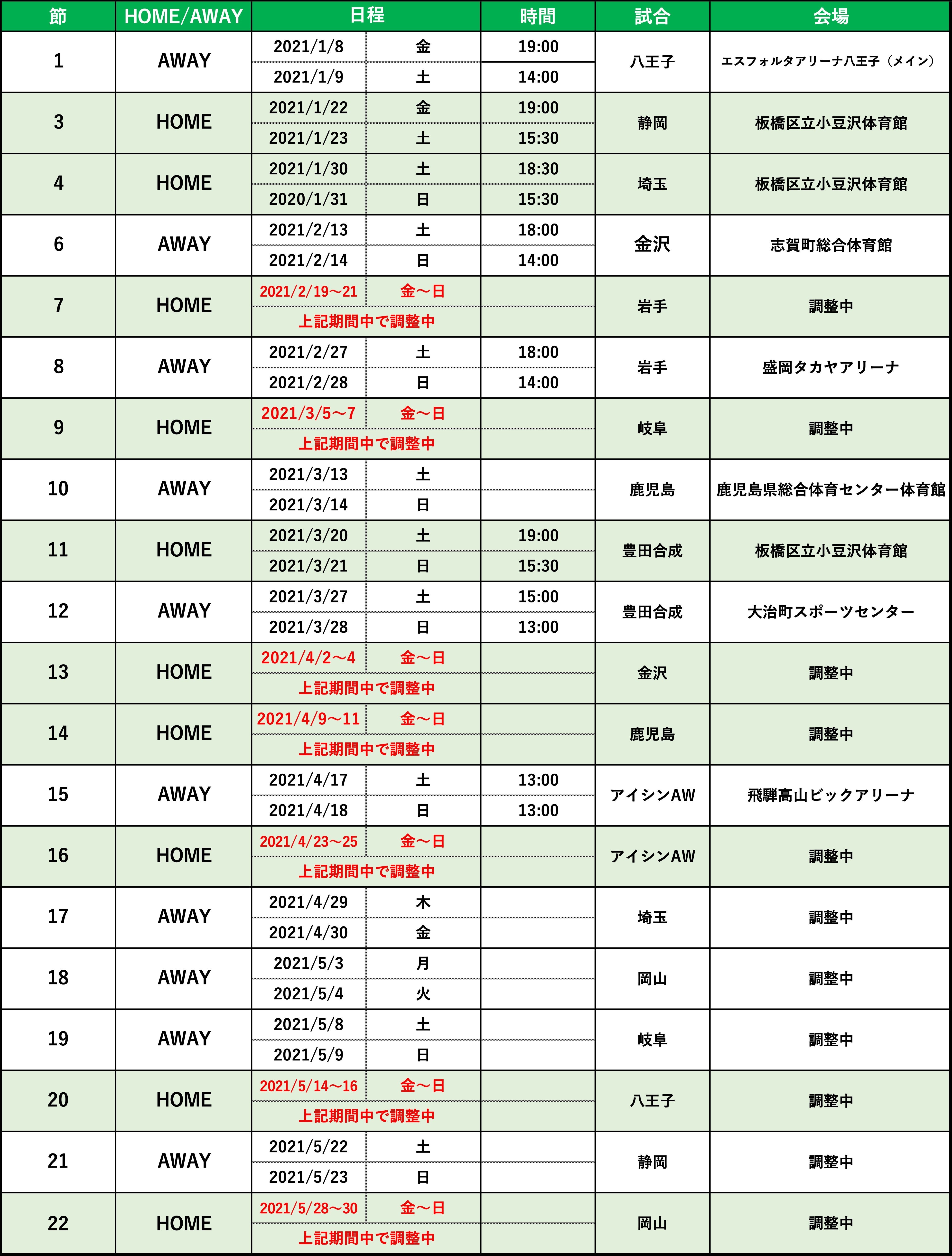 ホームゲームの赤字になっております日程は、記載の期間内で調整中となります。