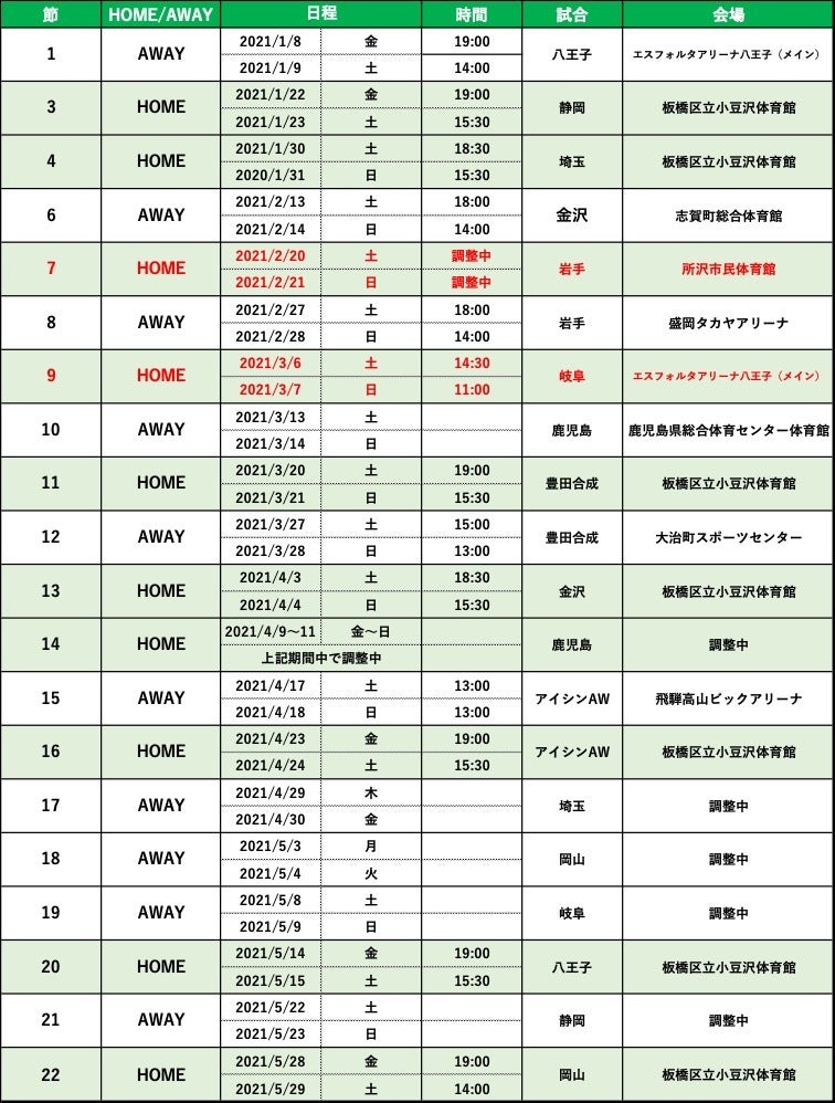 2020-21シーズン調整中の試合日程・時間・会場更新のお知らせ