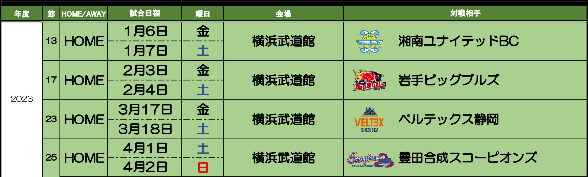 シーズンシート2023対象試合(横浜武道館開催試合)日程