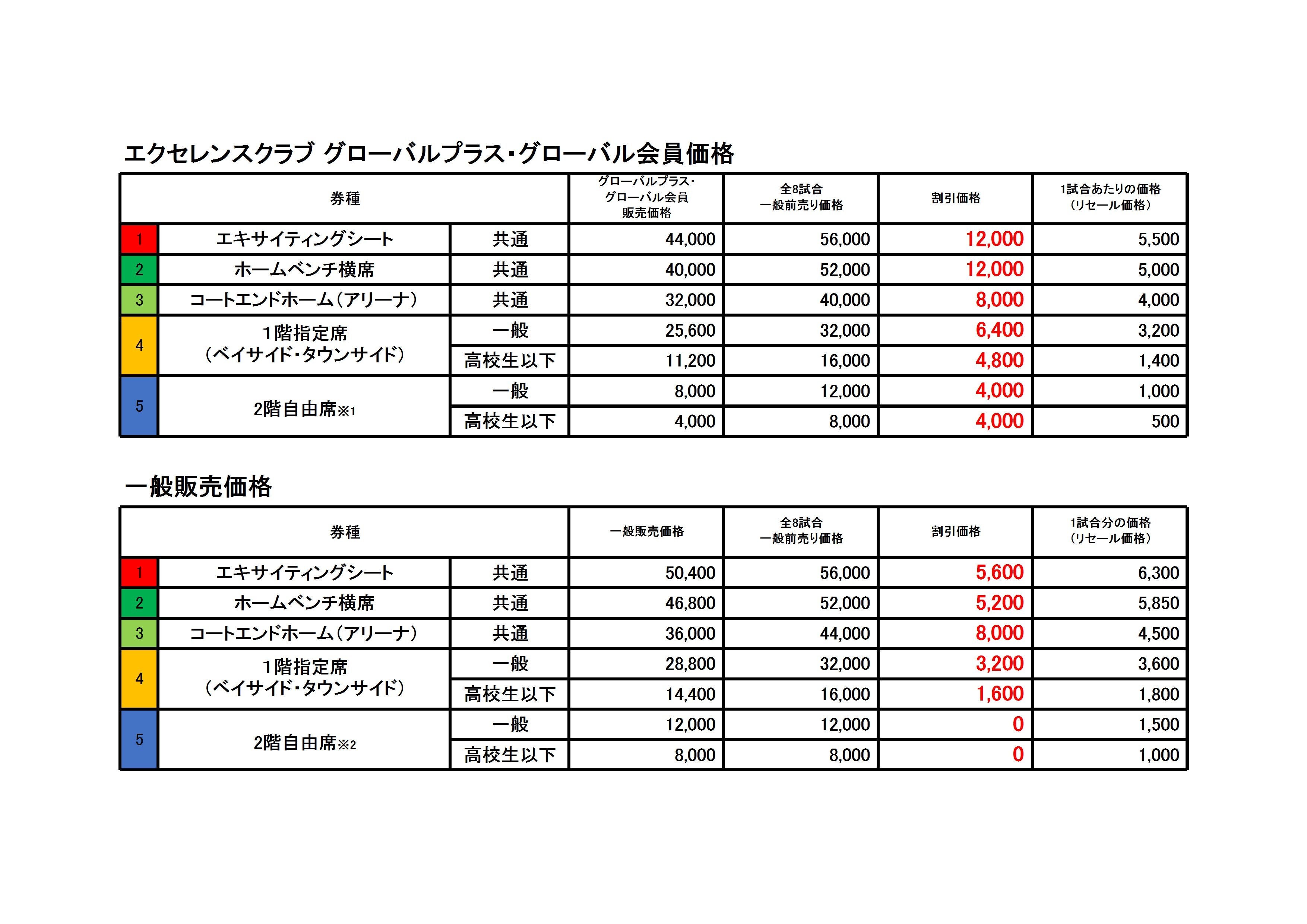 ※1 2階自由席については、エクセレンスクラブ前売り価格(一般:1,000円/枚 高校生以下:500円/枚)のためシーズンシート割引はございません。表は一般前売り販売からの割引価格となります。