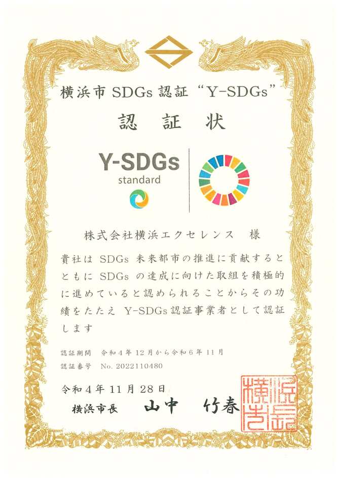株式会社 横浜エクセレンス(本社:横浜市中区)は、2022年11⽉30⽇付けで、横浜市が実施する「横浜市SDGs認証制度”Y-SDGs”」に認証されました。