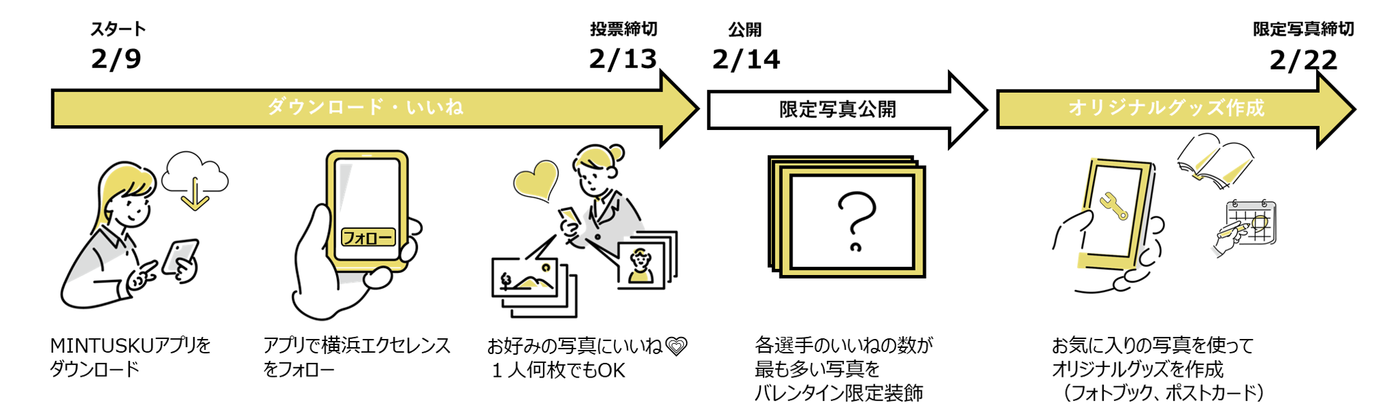 MINTSUKU(みんなでつくる公式フォトプラットフォーム)にて、各選手のいいねの多い写真をバレンタイン特別仕様に加工して公開します。