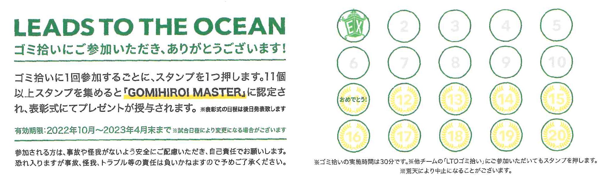 今シーズン、横浜エクセレンスでは各節、「LEADS TO THE OCEAN ~ 海につづくプロジェクト ~ Supported by 西松建設」としてアリーナ付近のゴミ拾い活動を実施しており、レギュラーシーズンホームゲーム最終日に「規定の参加回数を満たした方」を「ゴミ拾いマスター」として表彰させて頂きますので、そのお知らせとなります。
