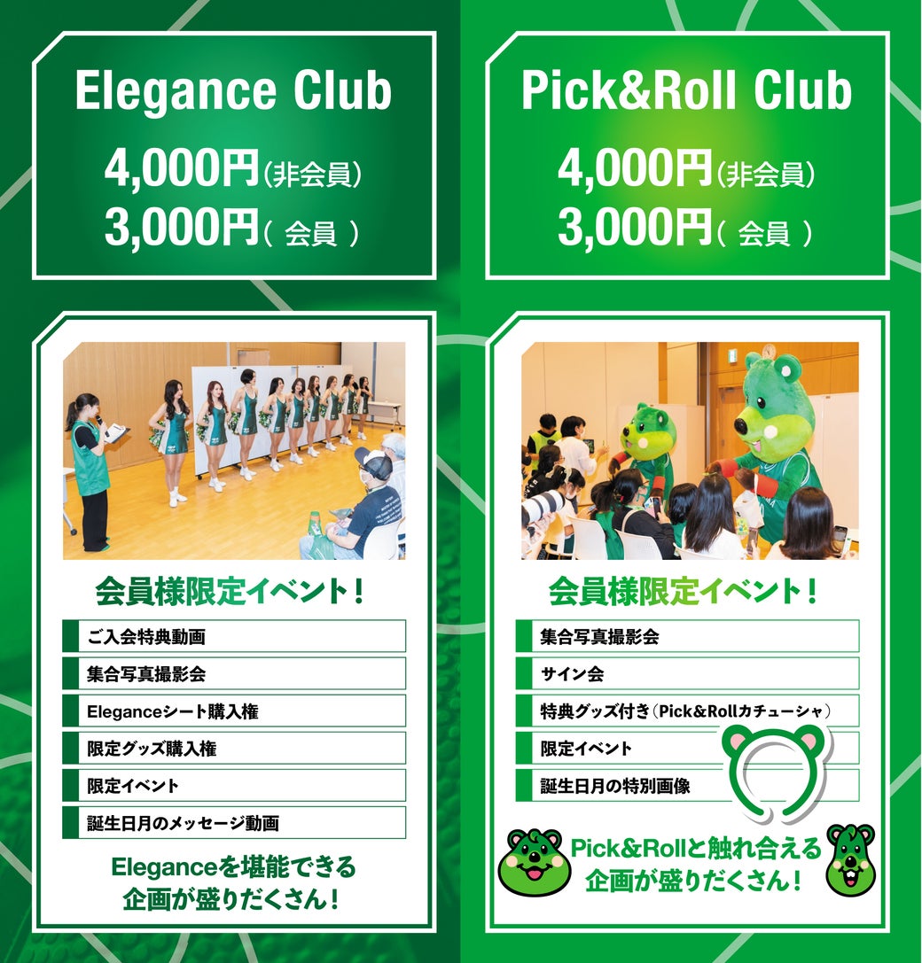 ずっと応援していただいている方も、初めての方も皆様にお楽しみいただけるよう、5つの会員グレード(VIP・プラチナ・ゴールド・シルバー・ジュニア)及び、2つのオプションコース(Elegance Club・Pick&Roll Club)をご用意しています。
