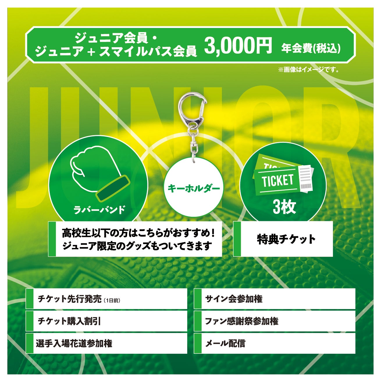 ジュニア会員でしかGETできないジュニア限定グッズや特典チケット3枚(1F指定席ベイサイド・コートエンドホームスタンド)がついてくるコースです!