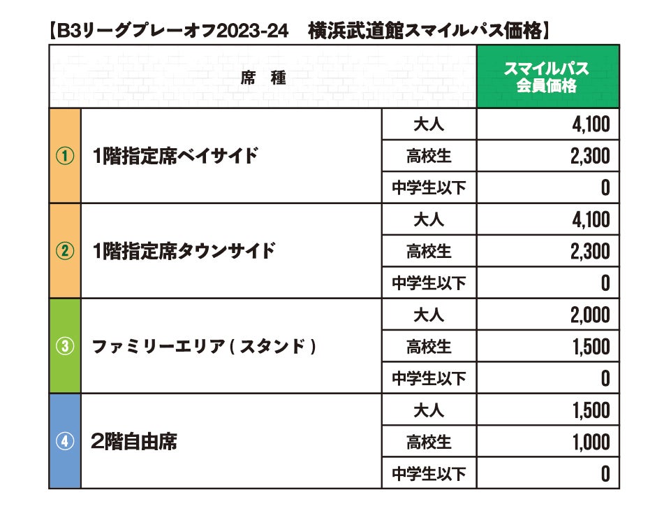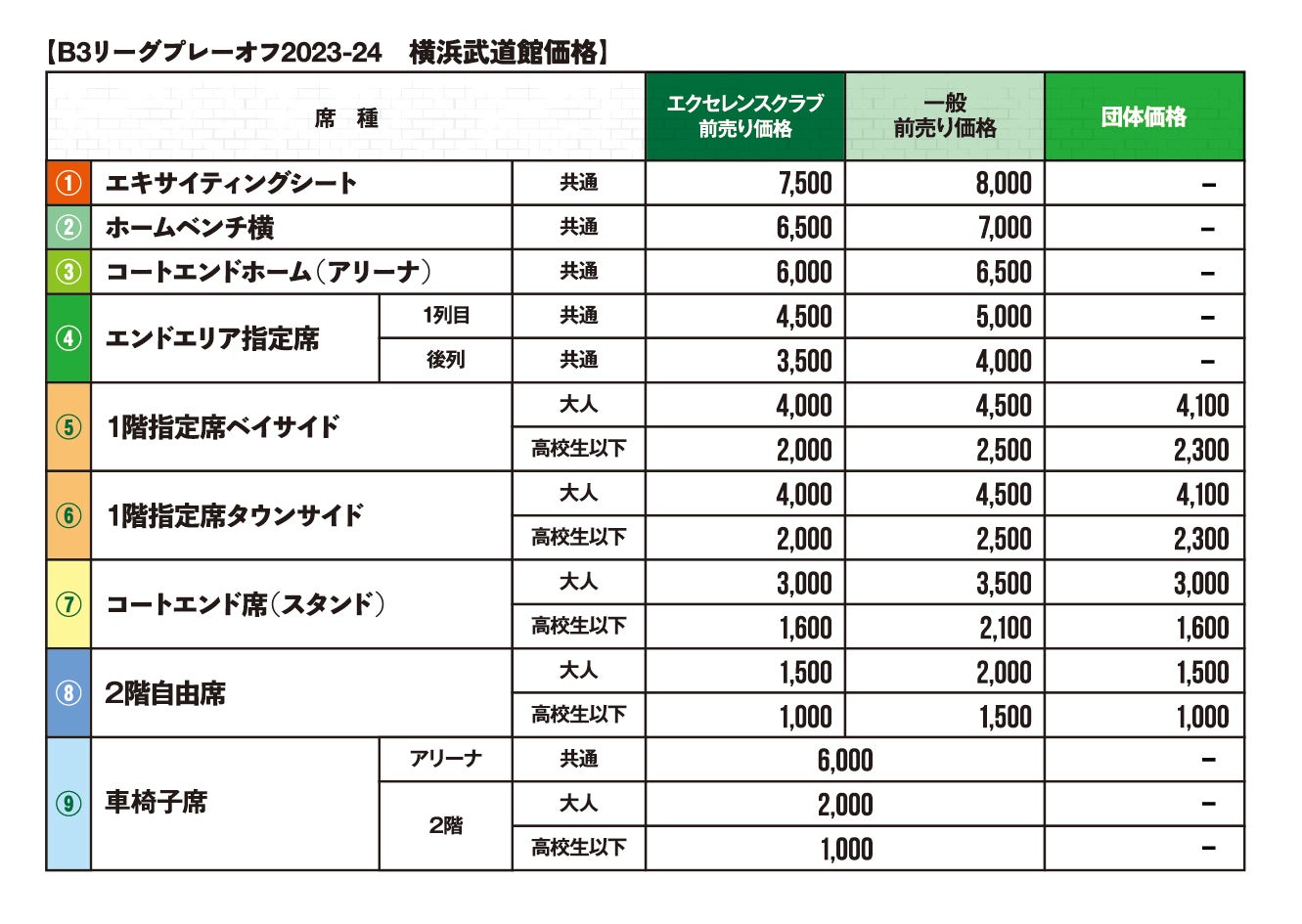 「B3リーグ プレーオフ 2023-24」価格として「B3リーグ レギュラーシーズン 2023-24」より全席種チケット代を500円プラスとさせていただいておりますので、予めご了承ください。
