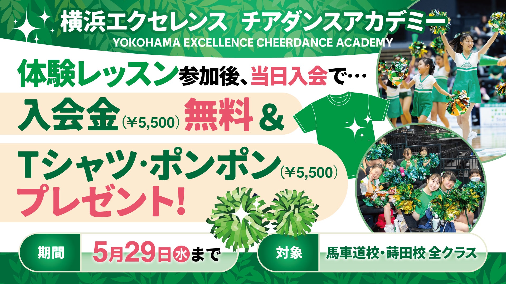 入会金(通常¥5,500)無料&Tシャツ・ポンポン(通常¥5,500)プレゼント!