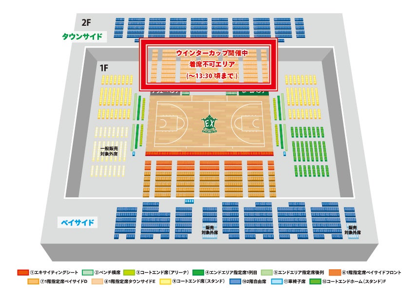「ウインターカップ 神奈川県予選 決勝」開催に伴い、11月2日(土)の「1階指定席タウンサイドE」をご購入いただくお客様につきましては、各学校の応援席となるため、13:30まではご自身のお座席に着席いただくことが出来ません。そのため、ウインターカップ開催中(※13:30まで)の間は2階自由席でのご観戦をお願いいたします。