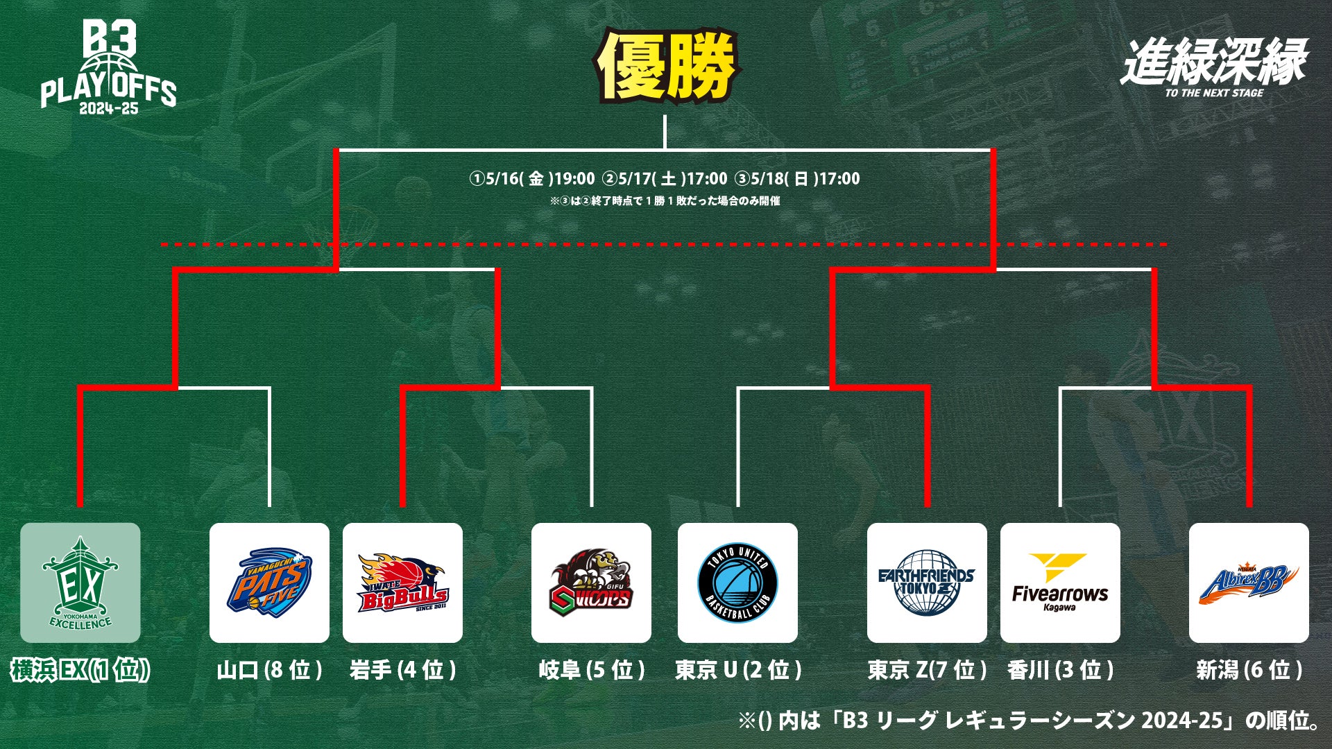 「B3リーグ レギュラーシーズン 2024-25」上位8クラブによるトーナメント戦(3戦2勝方式)、最多24試合(最少16試合)
