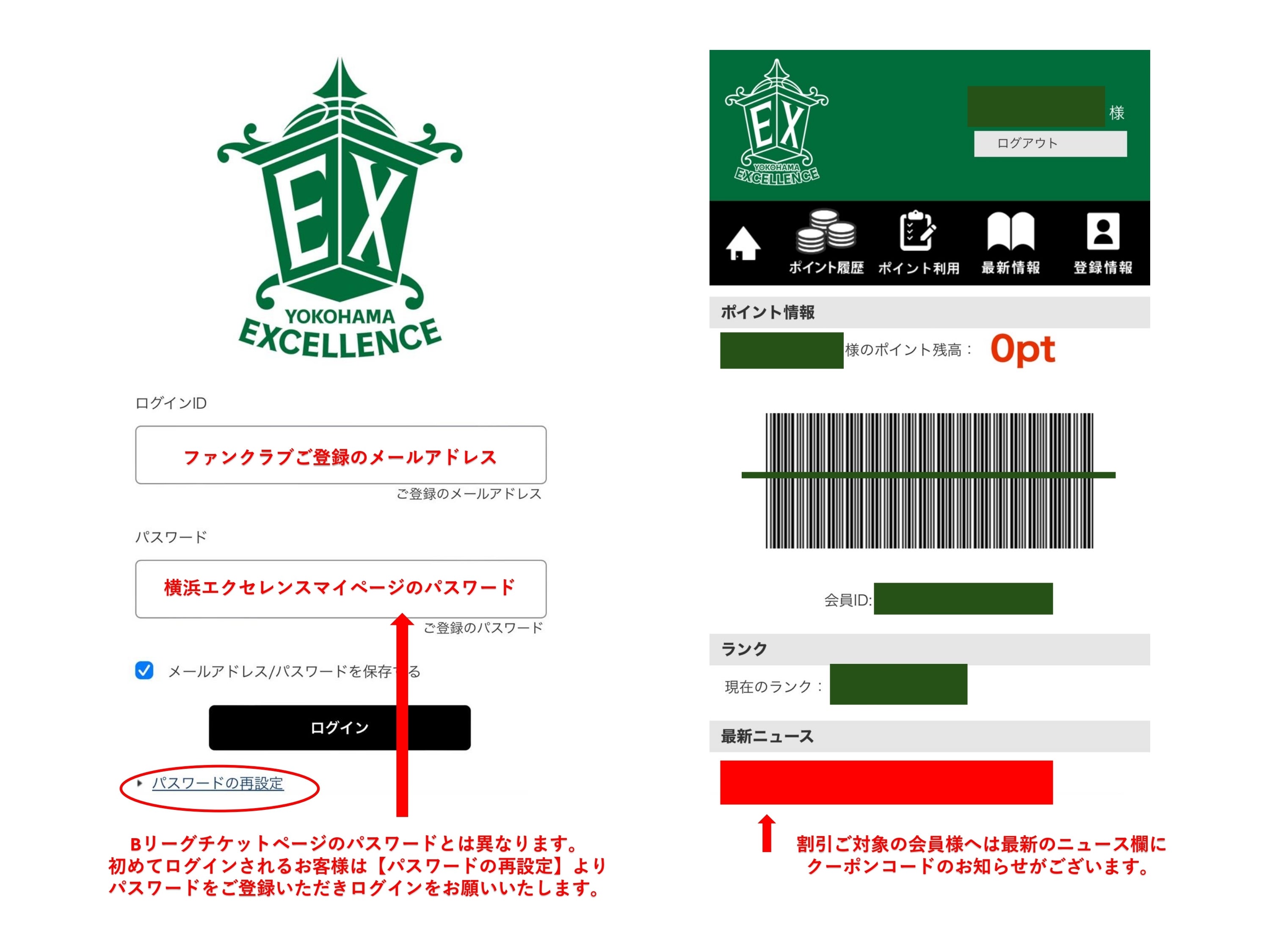 エクセレンスクラブ(※ファンクラブ)のマイページのお知らせ欄に、各会員様の割引クーポンパスコードを掲載しております。