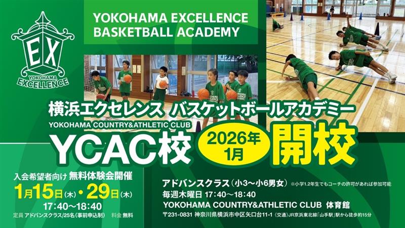 横浜エクセレンスでは2026年1月よりYOKOHAMA COUNTRY&ATHLETIC CLUBで[横浜EX バスケットボールアカデミーYCAC校]が開校し、
