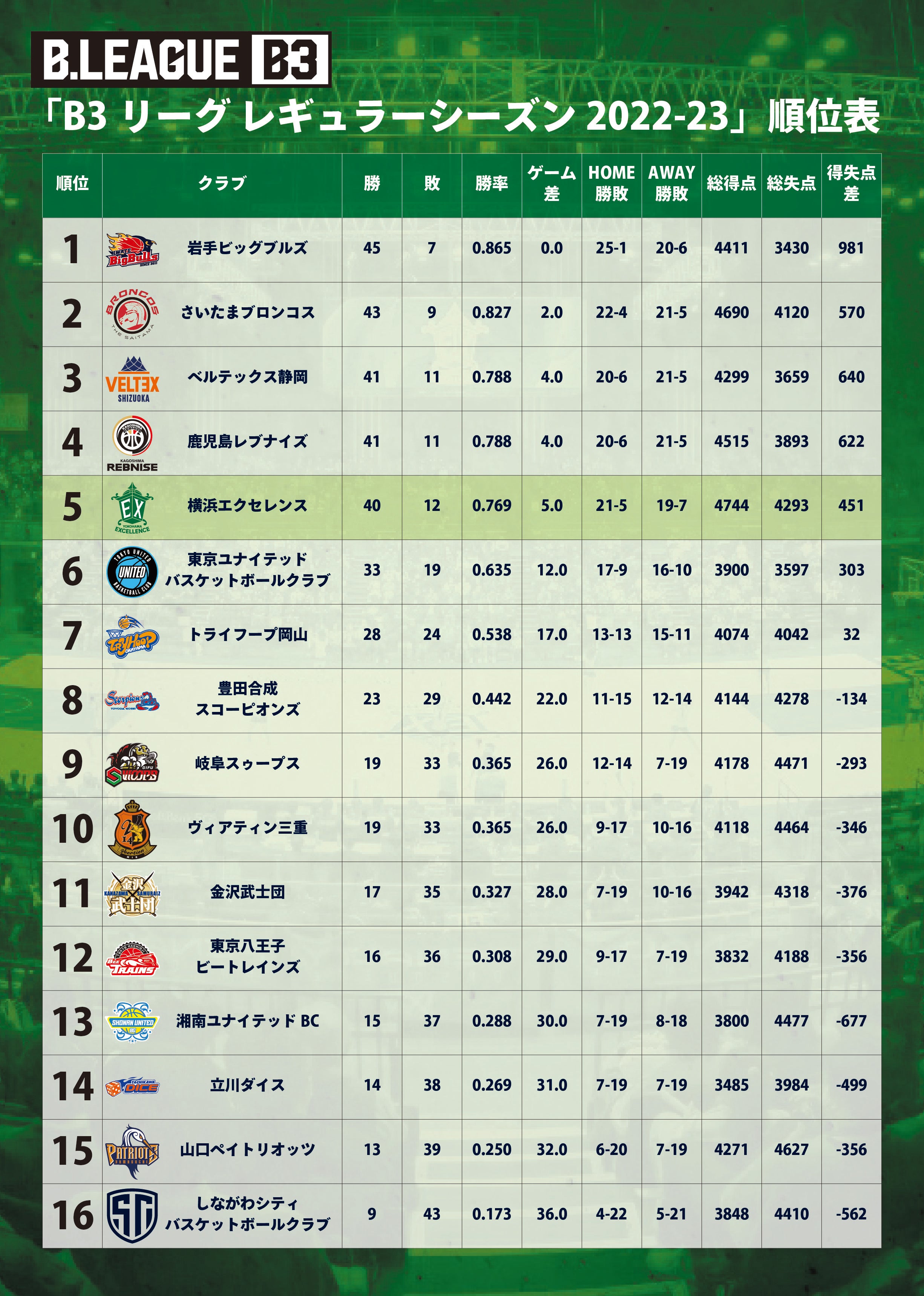 なお、「B3リーグ レギュラーシーズン 2022-23」の最終順位詳細は こちら でご確認いただけます。