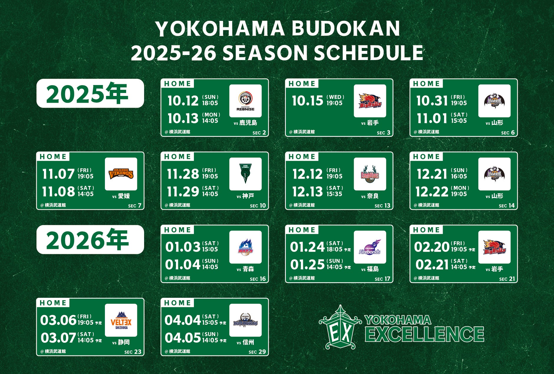 「りそなグループ B.LEAGUE 2025-26 B2リーグ戦」横浜エクセレンスホームゲーム「横浜武道館」開催の全12節23試合をご指定の同じお席で